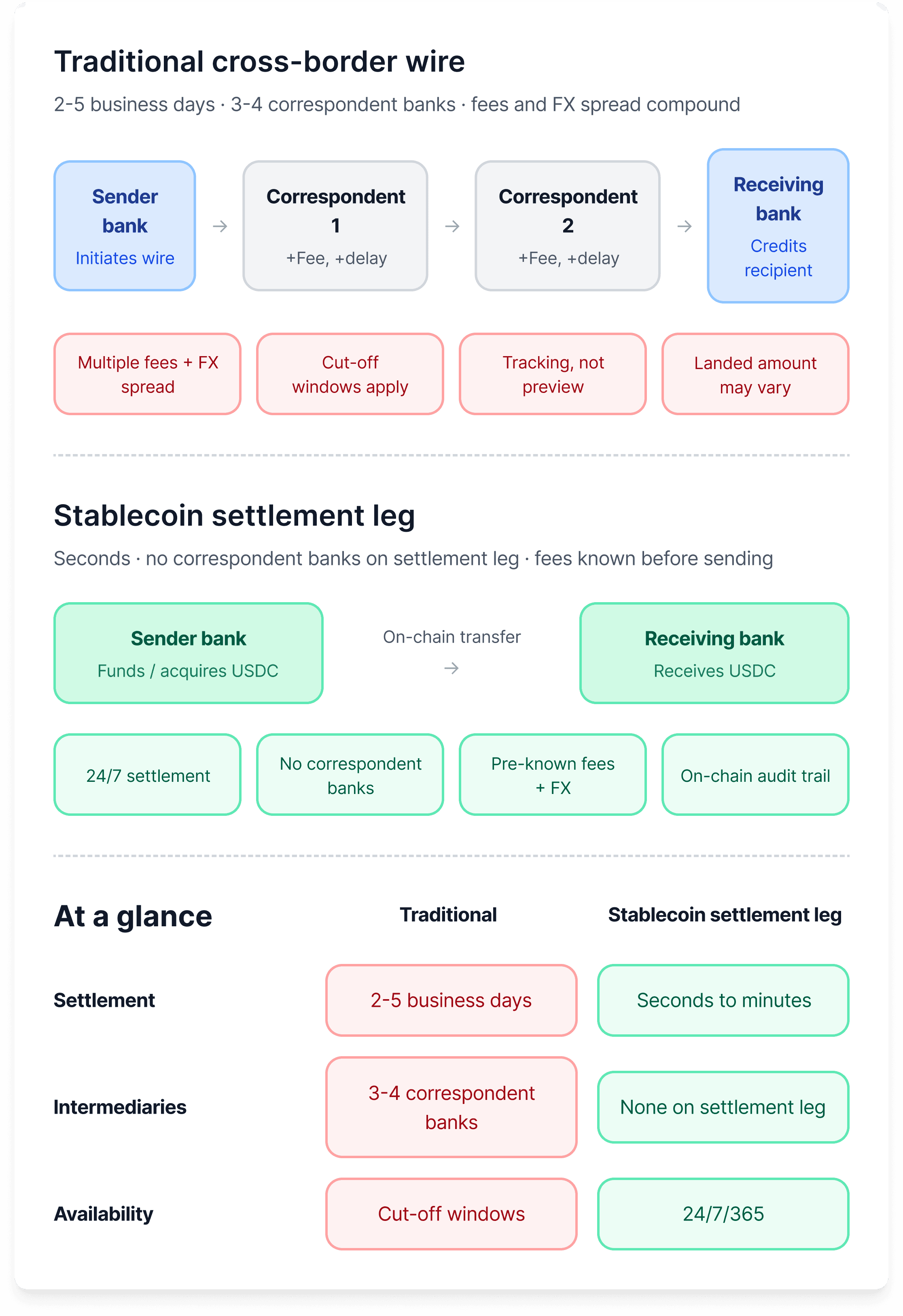Stablecoin payments settle on a blockchain in seconds or minutes, seven days a week, with low transaction costs and without requiring correspondent banks or batched settlement cycles. Traditional cross-border payments can take two to five business days depending on the corridor and route through multiple intermediaries. Stablecoins also provide full pre-transaction visibility into fees and timing.