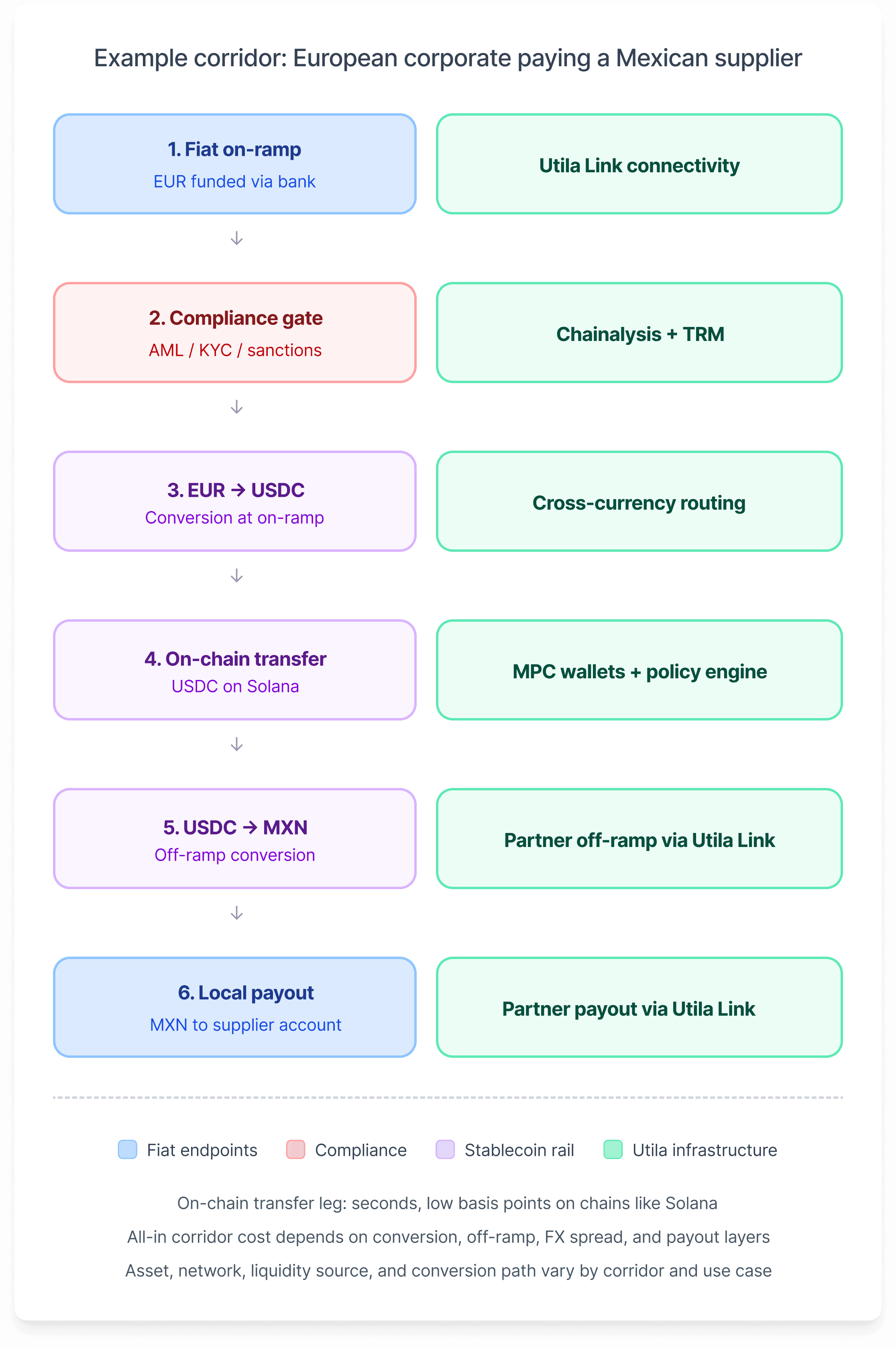 Many of the stablecoin use cases covered in this article follow a similar pattern: a client funds in one fiat currency, value moves through a stablecoin rail, and the recipient receives payout in another fiat currency. A European corporate paying a Mexican supplier, for example, might fund in EUR, settle through USDC on Solana, and deliver MXN to the supplier’s local account. For the bank, the challenge is not just the stablecoin leg in the middle, but the full conversion path around it.