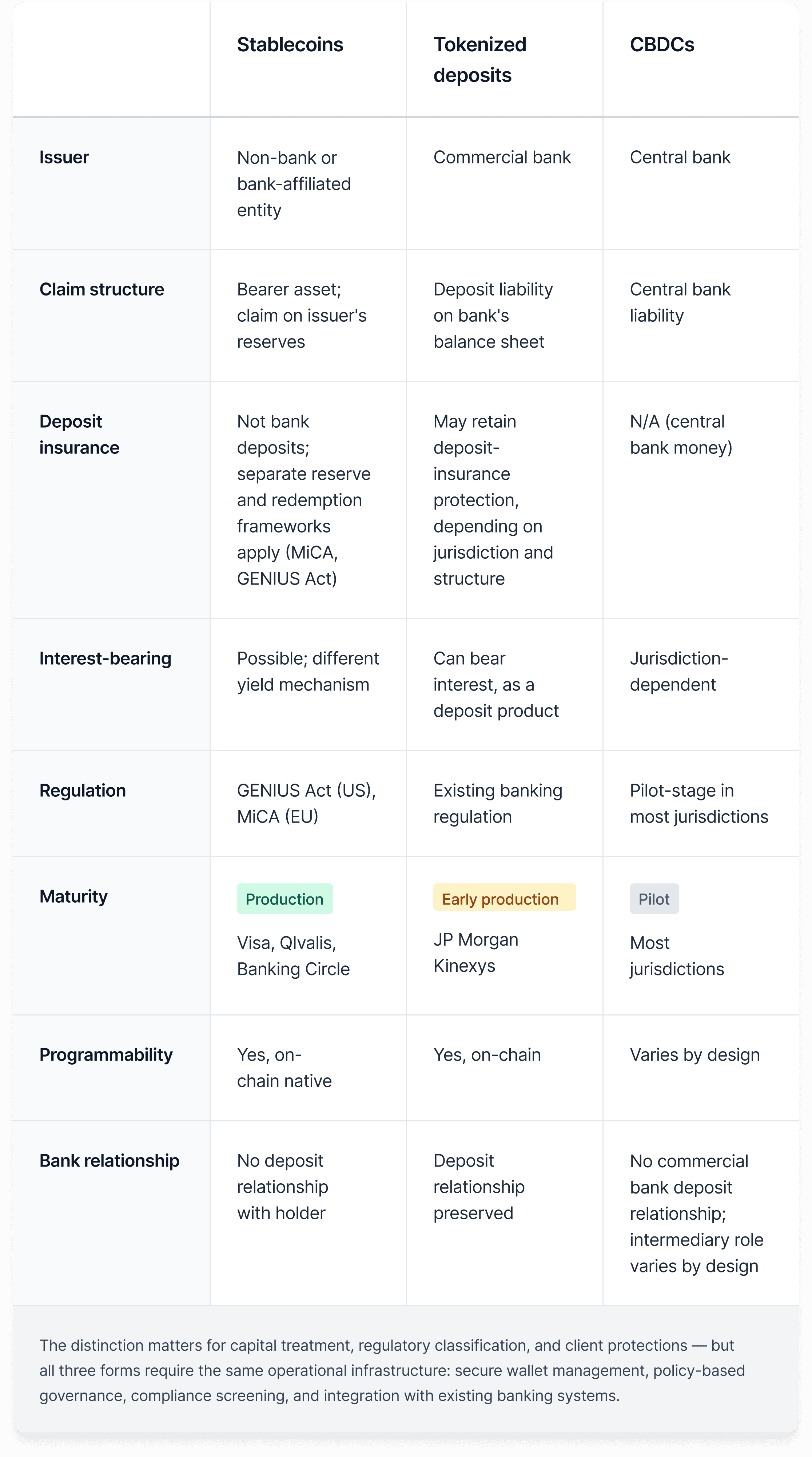 One distinction worth noting is that tokenized deposits can potentially pay interest, because they remain bank deposits. Interest-bearing stablecoins also exist, but the yield mechanism is different and the holder does not maintain a deposit relationship with a regulated bank. From a banking perspective, not all yield-bearing digital money carries the same regulatory standing, client protections, or balance sheet implications.