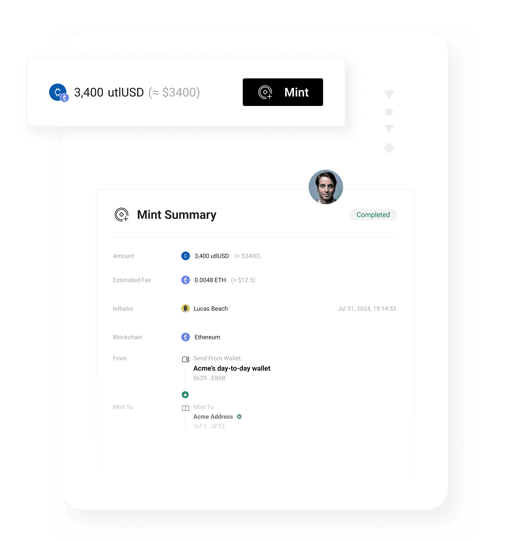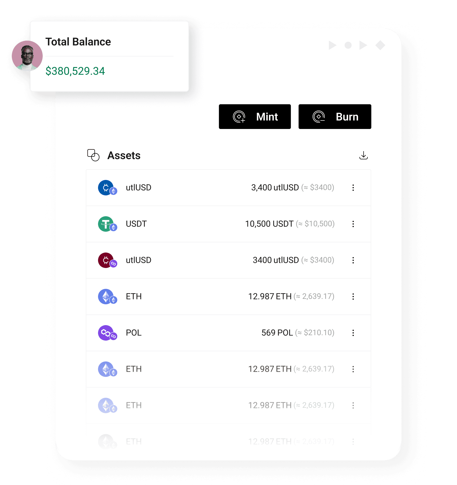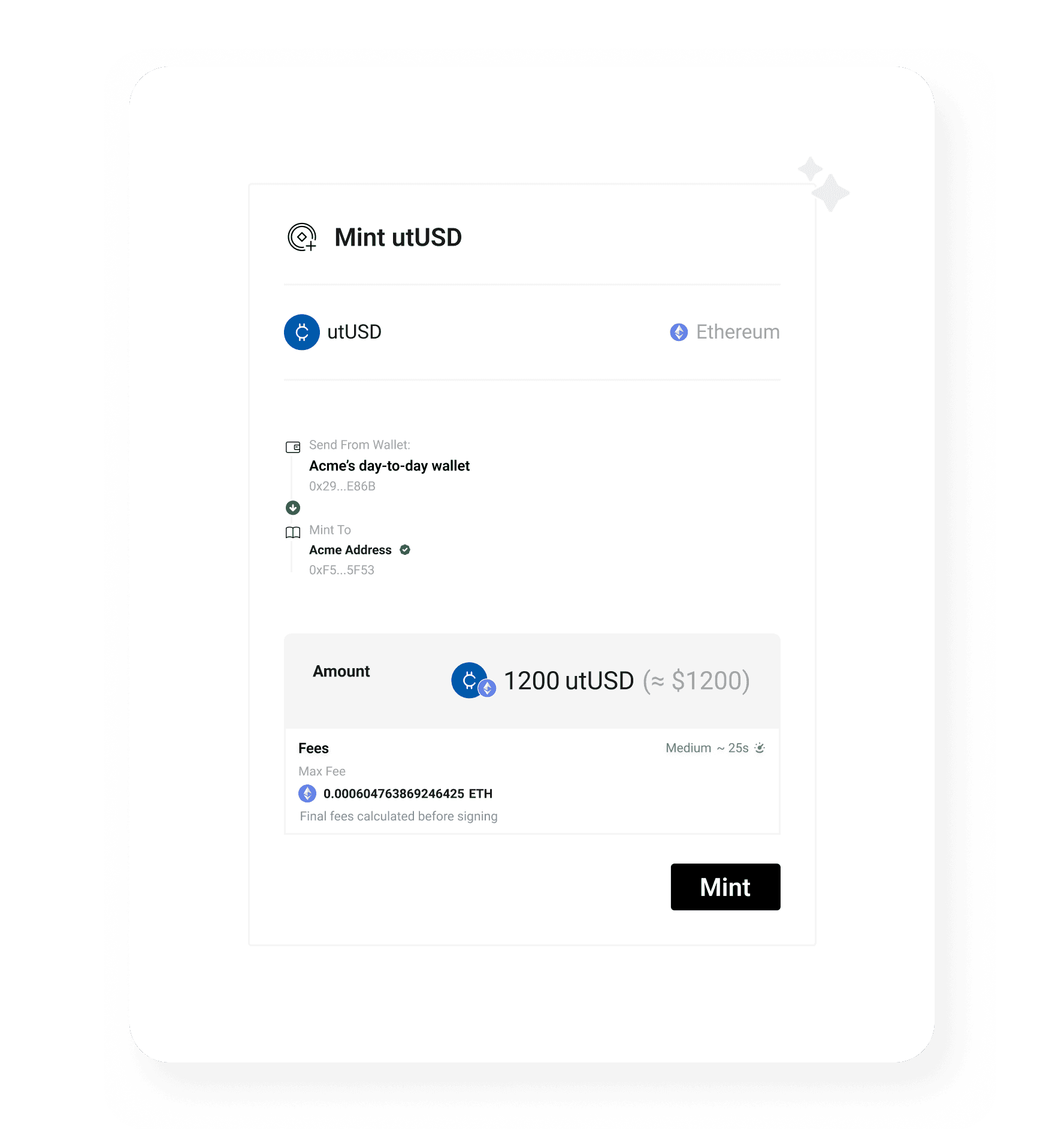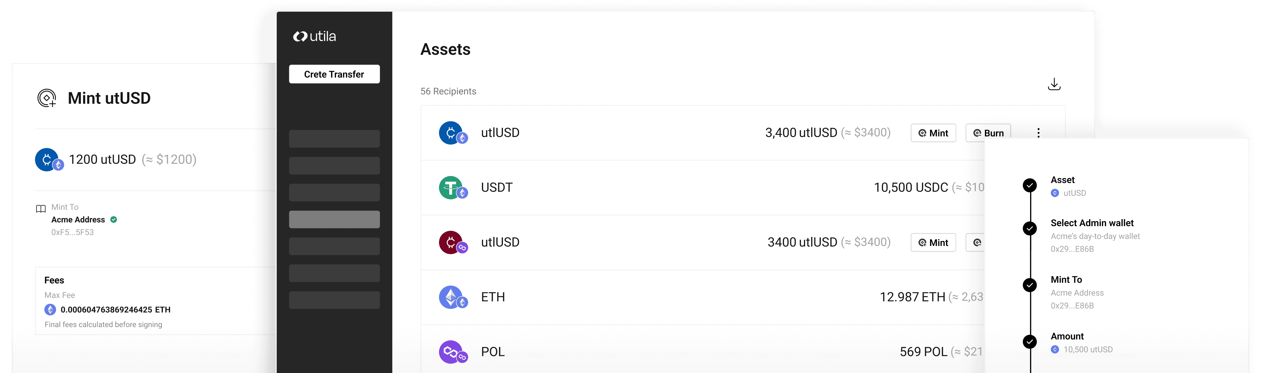 Deploy on multiple blockchains, distribute via exchanges and DeFi, plug into AML/KYT checks, and leverage banking rails for fiat settlement – all within Utila.